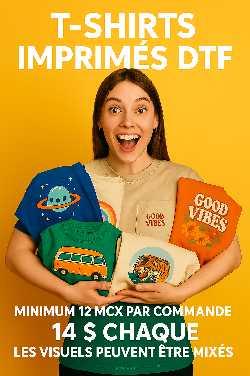 Offrez à votre équipe, événement ou entreprise un look unique avec notre impression DTF (Direct To Film) de qualité professionnelle.